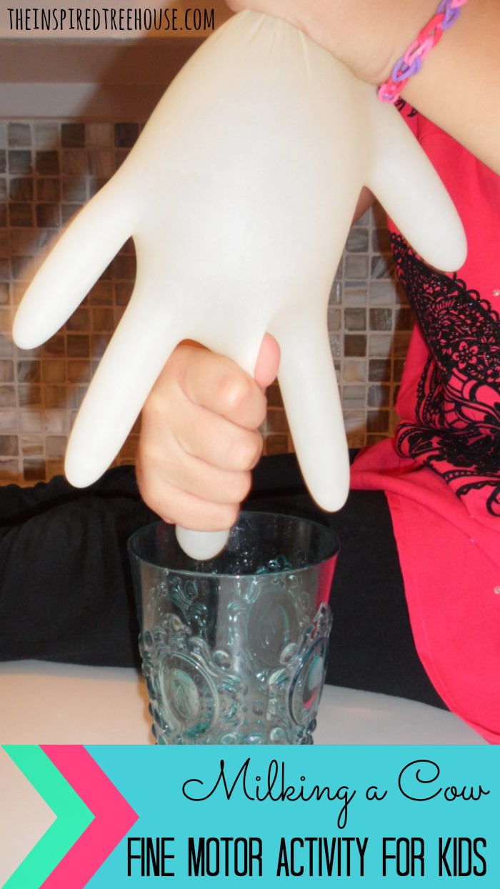 Milk a cow. Take a latex (or non-latex) glove. Fill with water (like a water balloon) and tie it closed. Then use a pin to prick holes in the tips of the fingers. Show your child how to “milk” the water out of the “udder.” (Sources: see Pinterest)