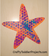 Bubble wrap prints. Place bubble wrap on a tray. Dribble some paint on it. Let your child use their fingers or a paint brush to spread the paint around. Then press paper onto it to print the paper, then cut the paper into fish or starfish shapes. (photo Crafty Toddlers)