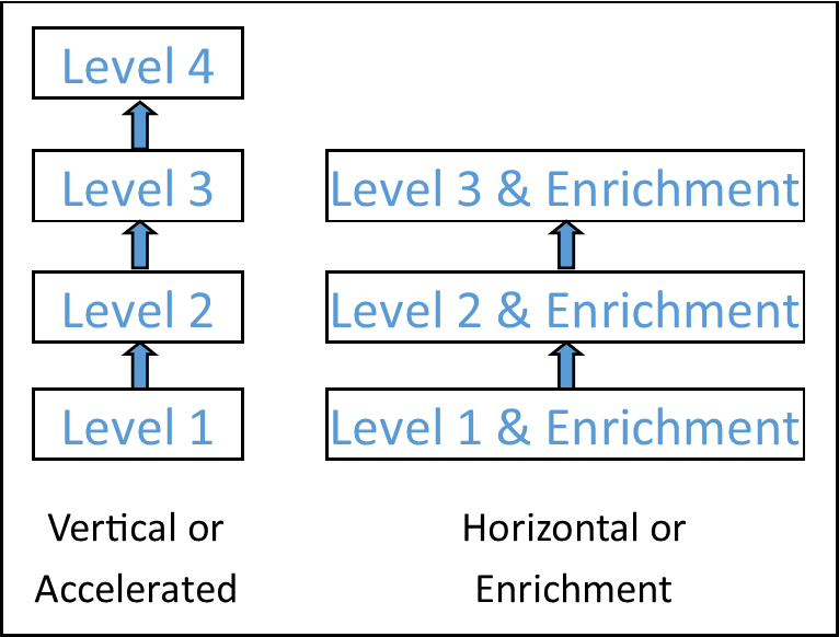 In gifted education, there are two major approaches – acceleration or enrichment. Acceleration just means moving more quickly through the stages of the same curriculum. So, if during a typical year, a typical student would do levels one through three of a subject, gifted kids would get through four levels, and end the year ahead of their age peers. Enrichment, or the horizontal approach, adds breadth and depth to each level, either through additional content or with project-based learning which enhances understanding. Children stay at the same overall level as their age peers (which can help with social interaction or ability in sports) but have learned about each topic more deeply than their non-gifted peers.