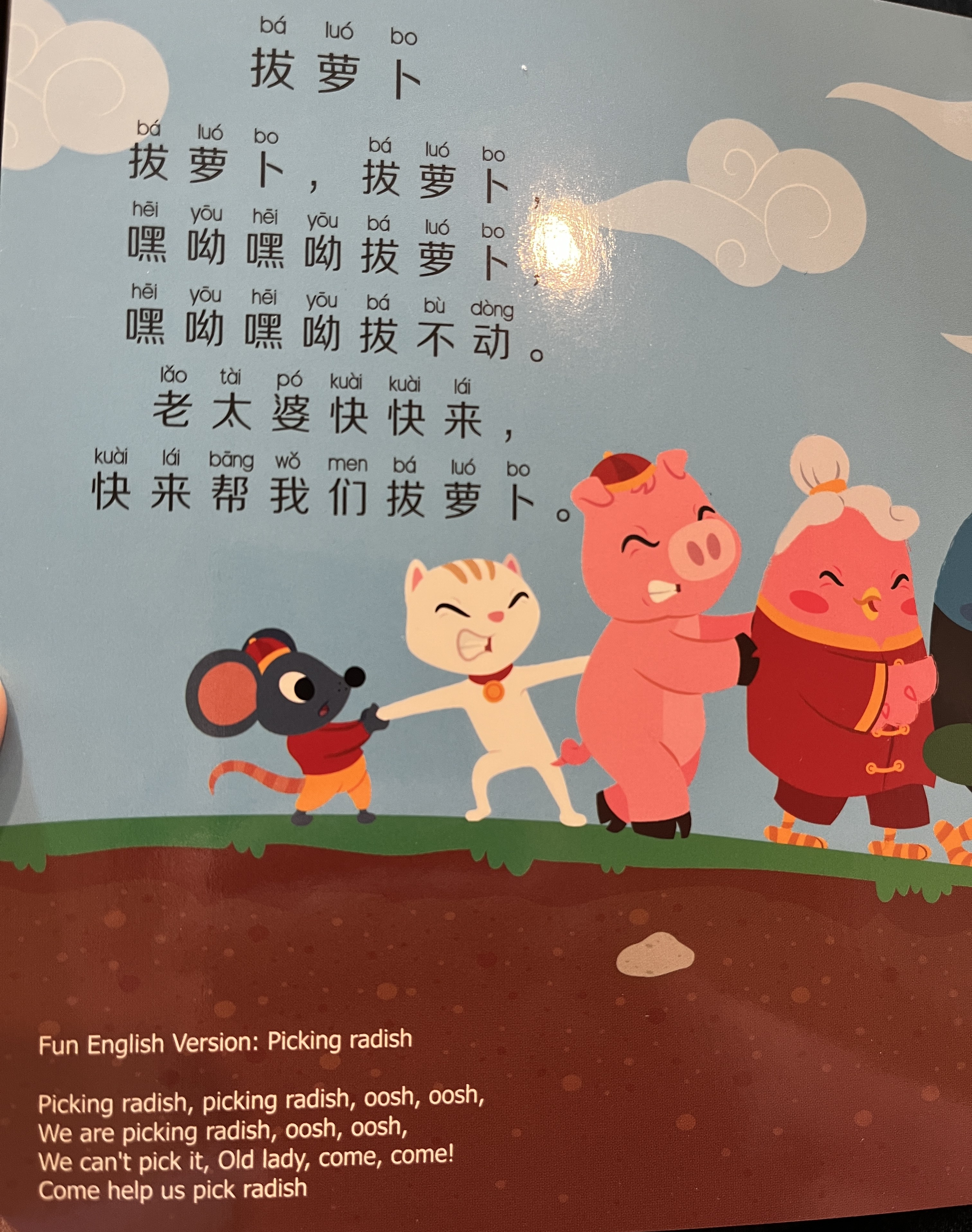 Pull the radish, pull the radish / hey-o, hey-o, pull the radish. / hey-o, hey-o, we can’t pull / Old lady come, quickly come / Come help us pull up the radish now