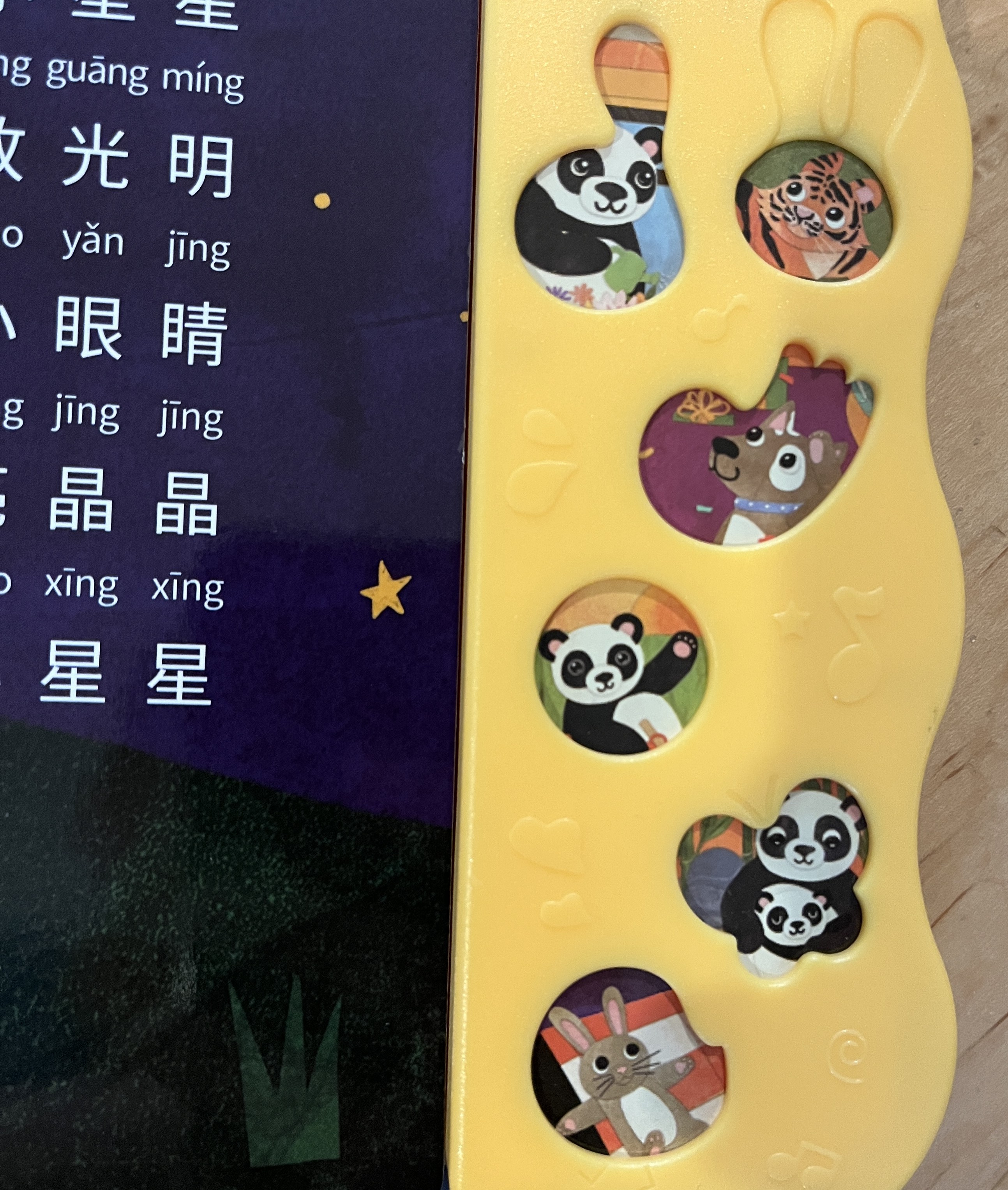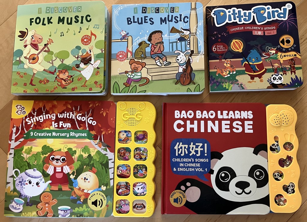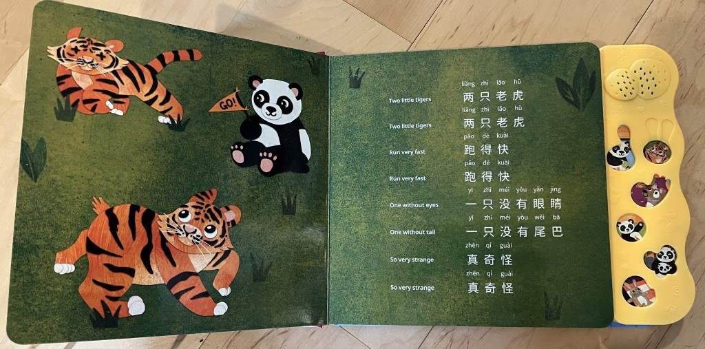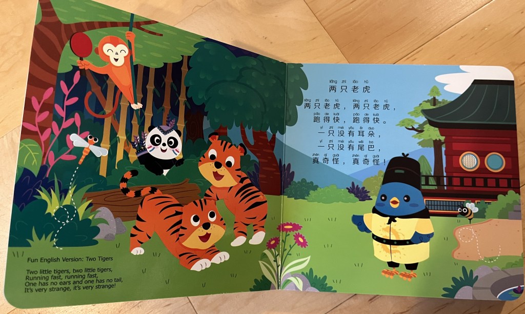 This company has 3 Chinese books, plus similar books in: Tagalog, French, Spanish, Korean and English. I reviewed their Chinese Volume 1 which includes 6 songs – some traditional Chinese – Two Tigers, FInd a Friend, and Mama is the Best in the World, and some traditional English – Itsy Bitsy Spider, Row Your Boat, and Twinkle Twinkle. It includes lyrics in English, pinyin, and Mandarin. (In a larger font than Ditty Bird.) The Mandarin words do line up with the English tunes. But I can’t make the English words scan well to the tunes for the Chinese songs.