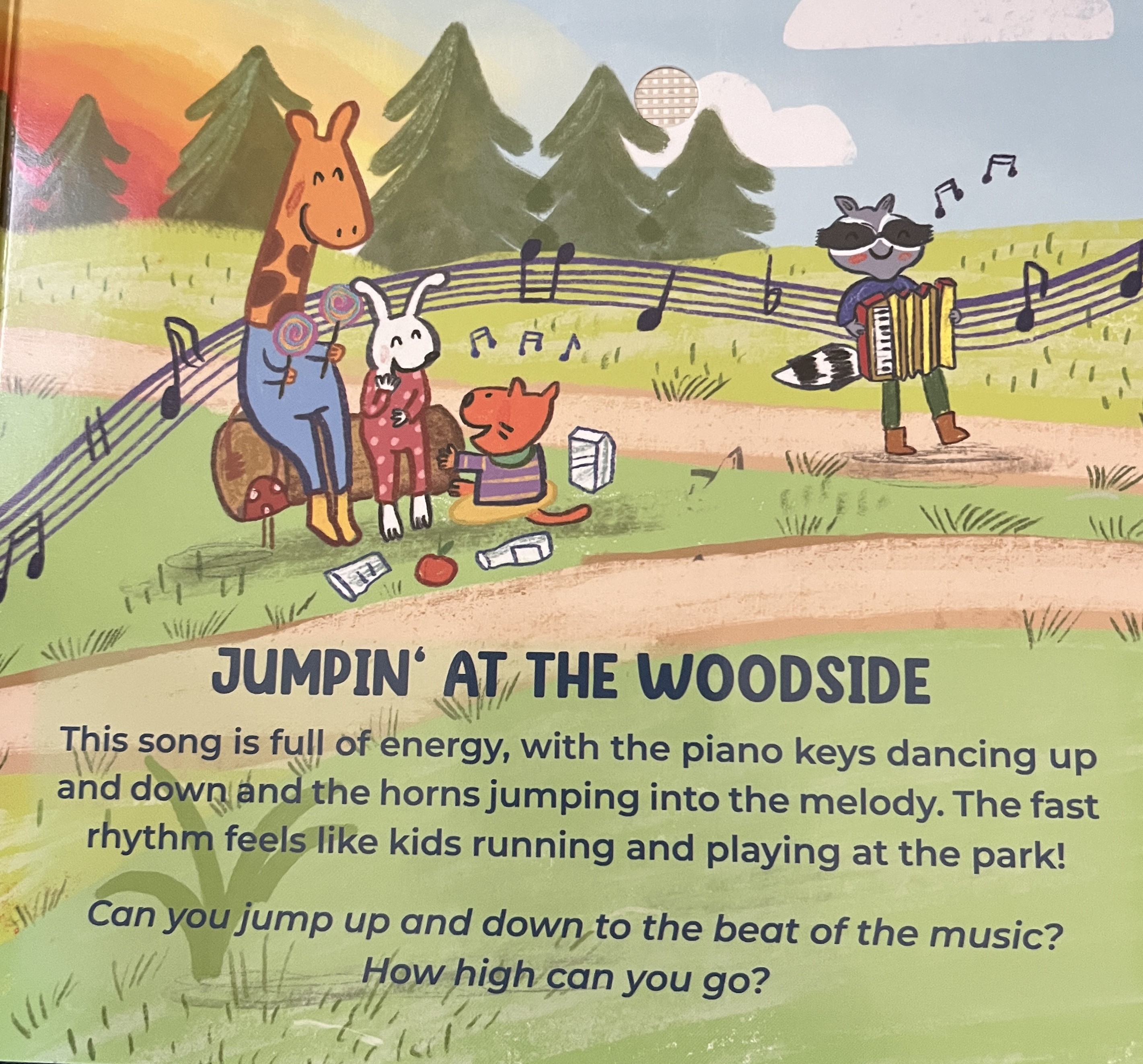 Some overall impressions: I like the size of the books – easy to pack, easy for small hands to hold. The pages are sturdy. The buttons to activate the music can be a little tricky for a child to spot for the first time, and activating them requires pressing precisely on them (a fine motor skill builder) but they work reliably. The speaker is on the back – so, if it’s laying flat on a surface, it is much quieter than if held upright. (That can be an advantage if you’re holding the book as you can adjust the volume a bit. If the child is using it lying flat on carpet, it’s pretty quiet.)