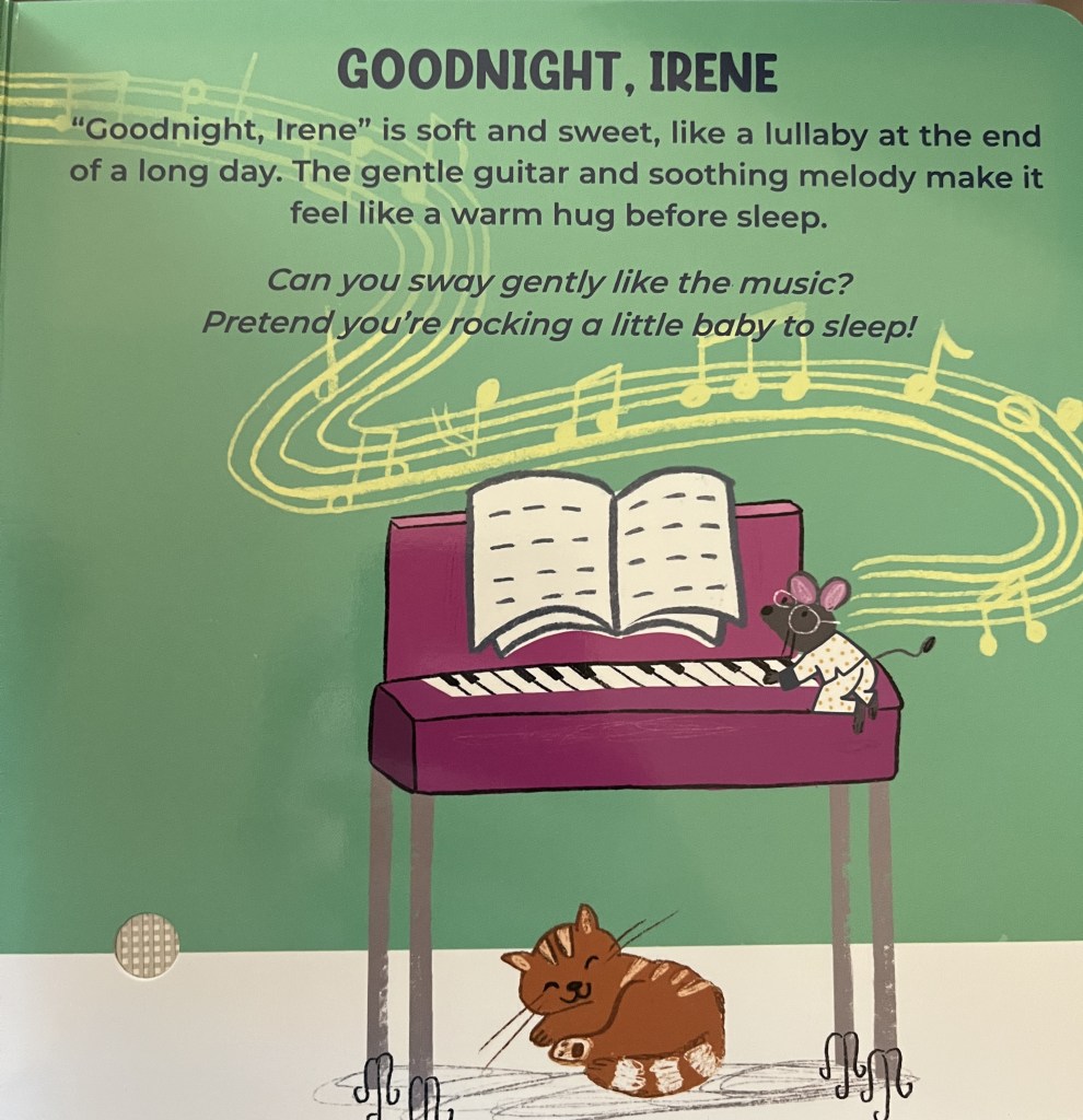 On Pirouette’s website, they have links to where you can find full versions on Spotify. (Though there’s not a QR code on the book to point you to this page.) A caution though: these are blues songs, so some of the lyrics in the full vocal performance aren’t kid friendly, for example, See See Rider says “I’m gonna buy me a pistol, Just as long as I am tall… Kill my man.” But you can also find instrumental only versions of the tunes. For Good Night Irene, there are kid friendly versions of the lyrics.