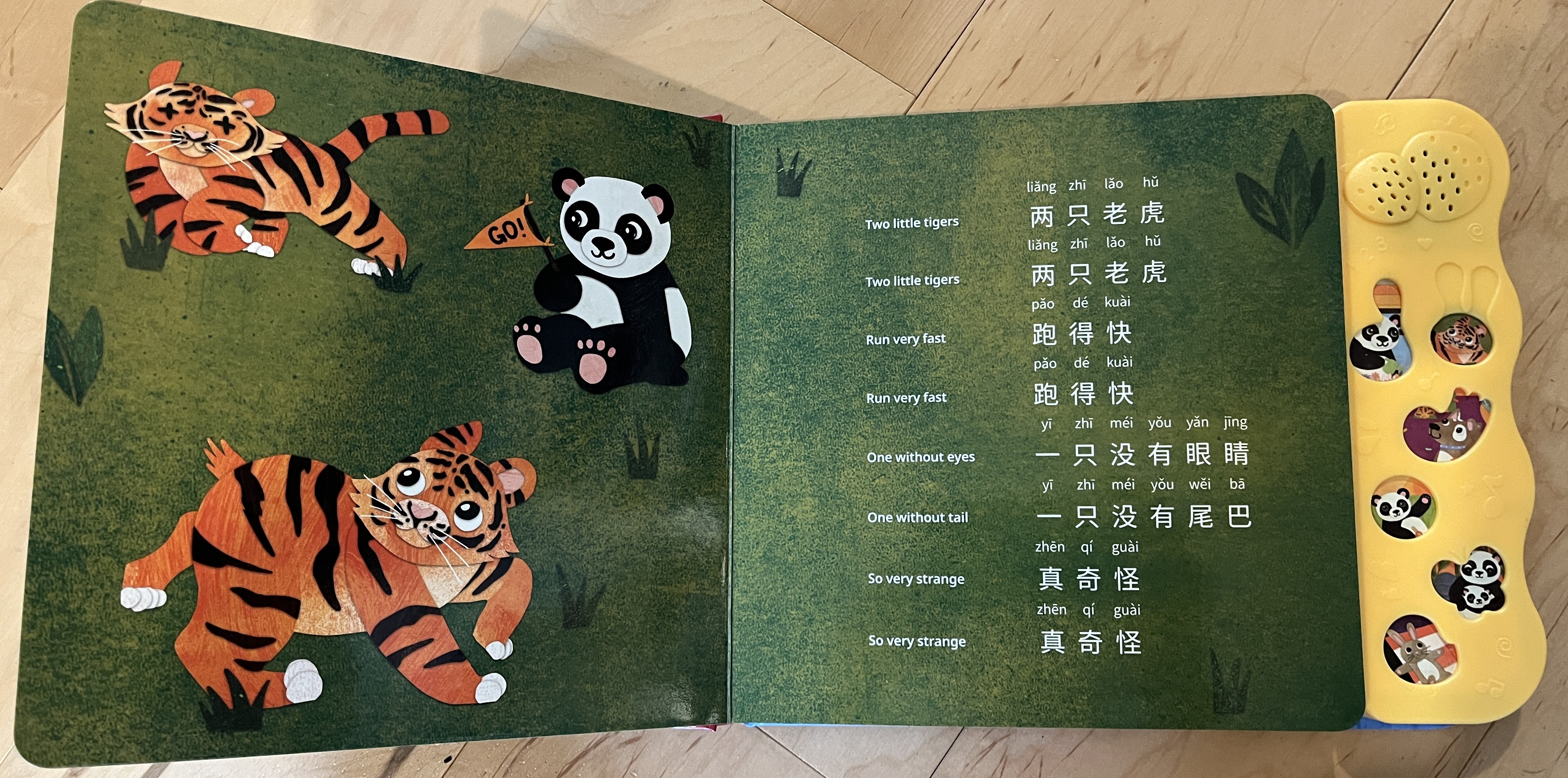 This is another large board book, with the controls on buttons off to the right side. There are two volume settings, controlled on that side panel. The child needs to figure out which of the 9 buttons matches the song for the page they’re on (the 10th button is just announcing the name of the book). Songs are up to 60 or so seconds.