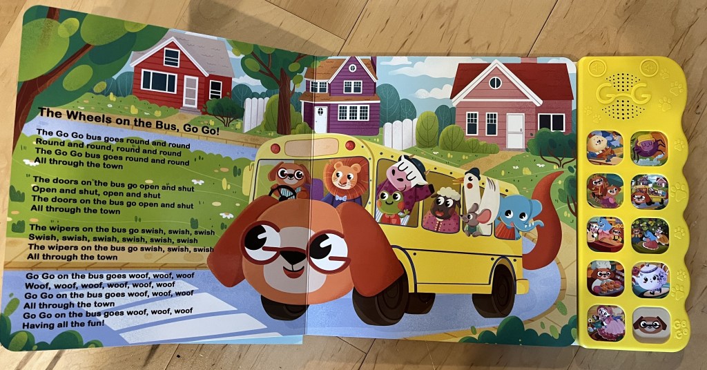This is a bigger book – a little harder for little hands to hold. The soundbox is to the side of the pages. It does have two volume settings to choose from. Since the buttons are off to the side, a child has to figure out which one to press to get the song that matches that page – the image on the button is just some small portion of the image that’s on the page, so I’m not sure it’s obvious to kids which image goes with which page. (And the soundbox has random shaped openings for the buttons that don’t really line up with the illustrations.)