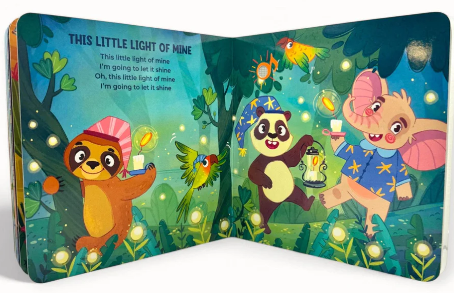 This board book has snippets of 6 folk music tunes (Oh Susanna, This Land, Little Liza Jane, Sarasponda, Home on the Range, This Little Light). Each page has the lyrics for 3 or 4 lines of the song, and a button that plays a 15 second clip. They are all performed by the same musician – Daria, who is pleasant to listen to and not cutesy / chirpy as many performers are when doing children’s songs. The illustrations by Margarita Fomenko, which feature animals doing human things, are pretty cute.