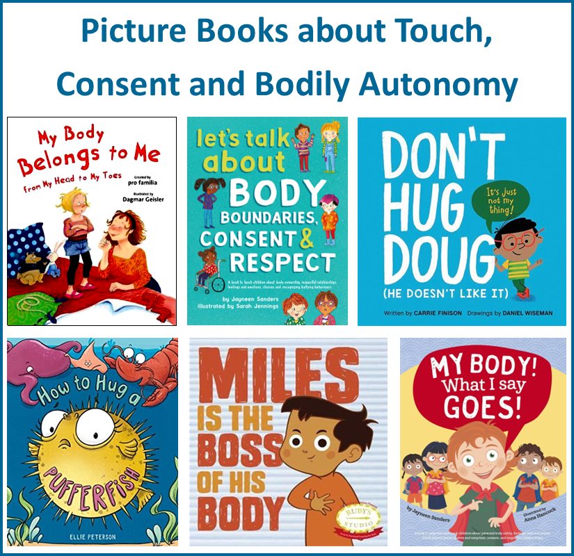 Let’s Talk about Body Boundaries, Consent and Respect by Sanders and Jennings. (Video) Ages 5 – 8. Starts with the idea of body boundaries – draw an imaginary bubble around yourself – no one should come inside that boundary without asking. If someone wants to hug someone, they should ask. The person might say yes – it’s OK to hug because both people are happy about it. The person might say no – respect that. If they say they’re not sure or don’t answer, that’s not a yes, so don’t hug. It’s OK to say no to others – it’s your body and what you say goes. If someone doesn’t respect that, tell a trusted adult. Excellent – but too long – you would want to spread it over multiple readings.