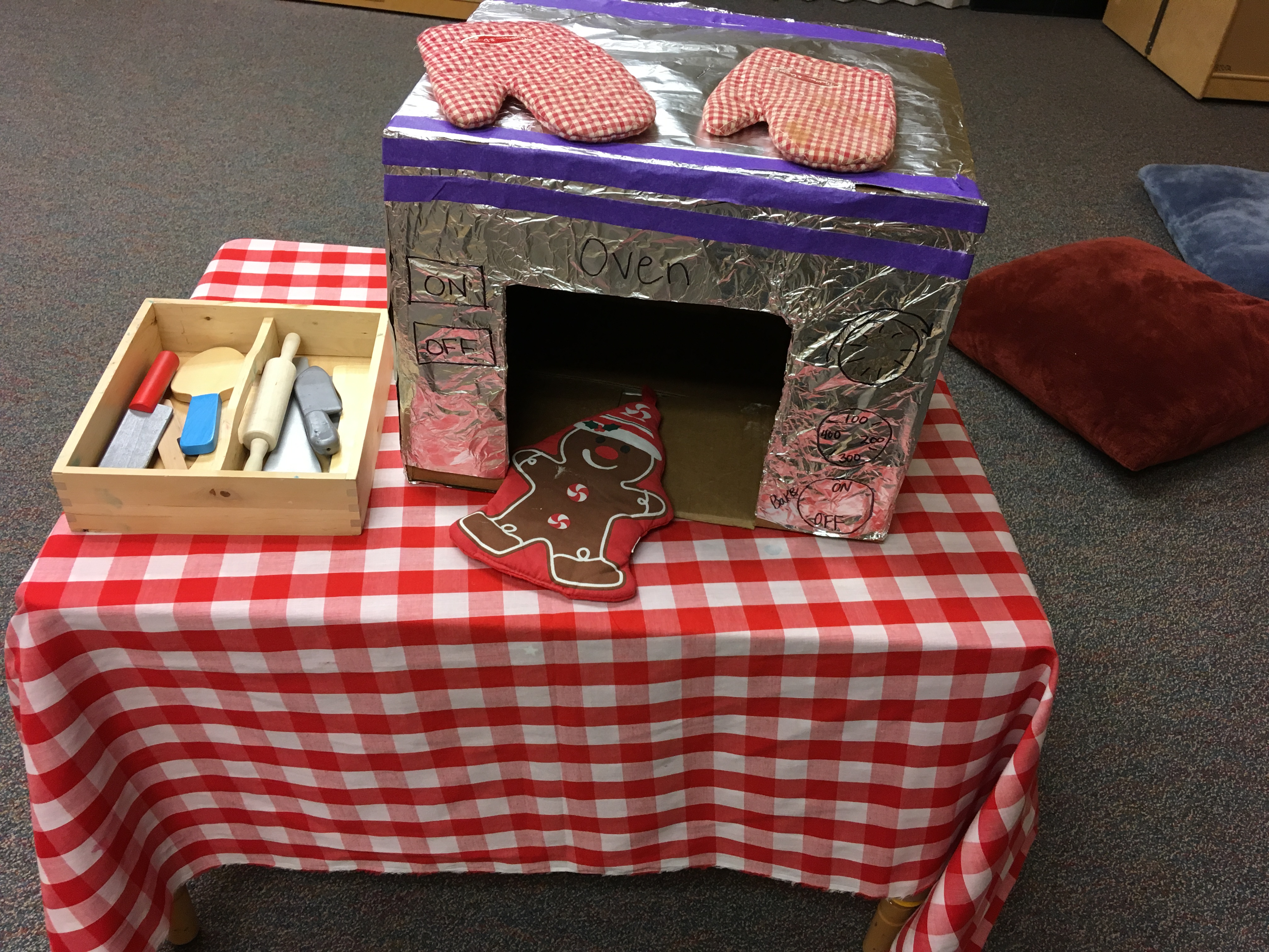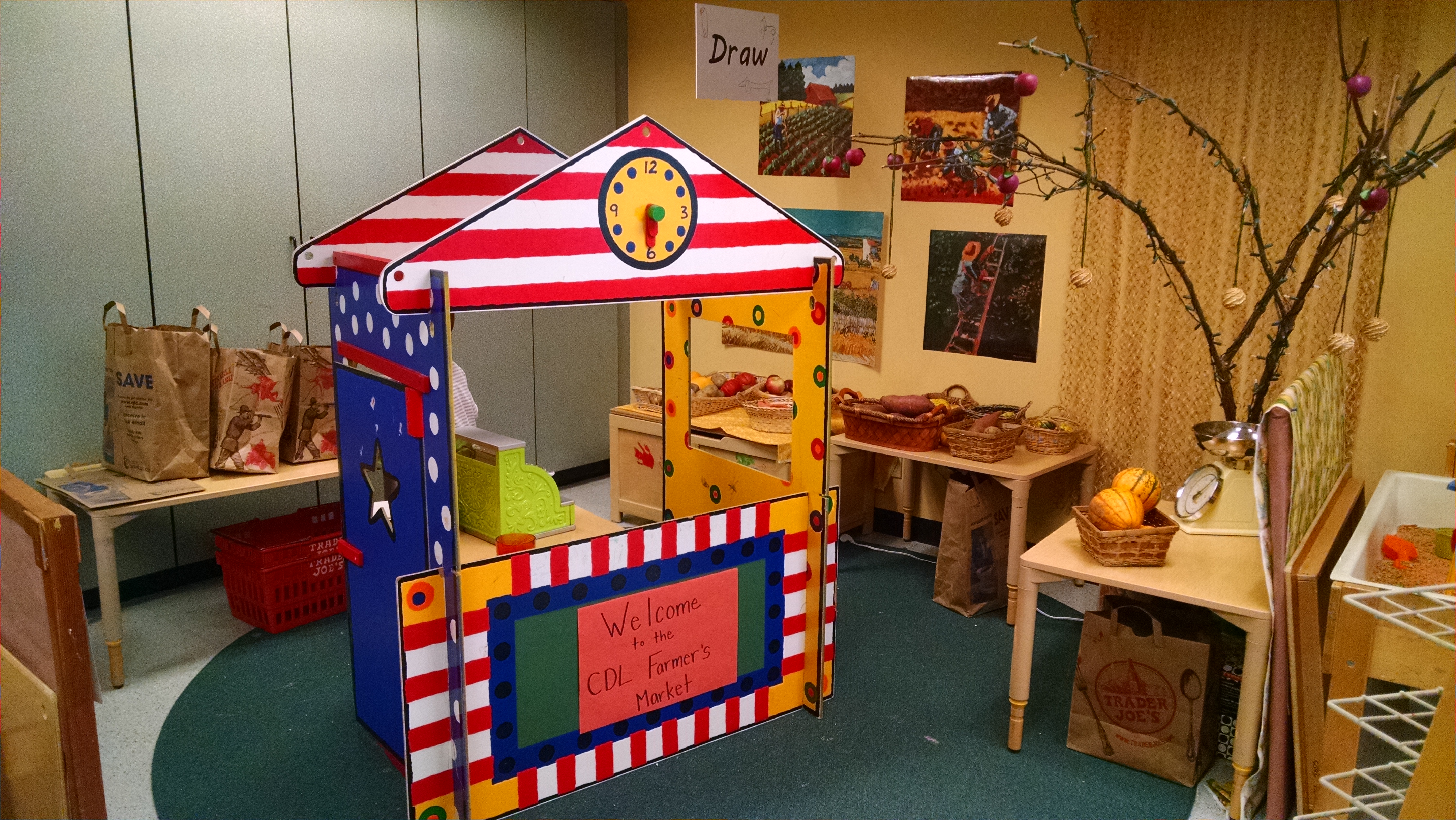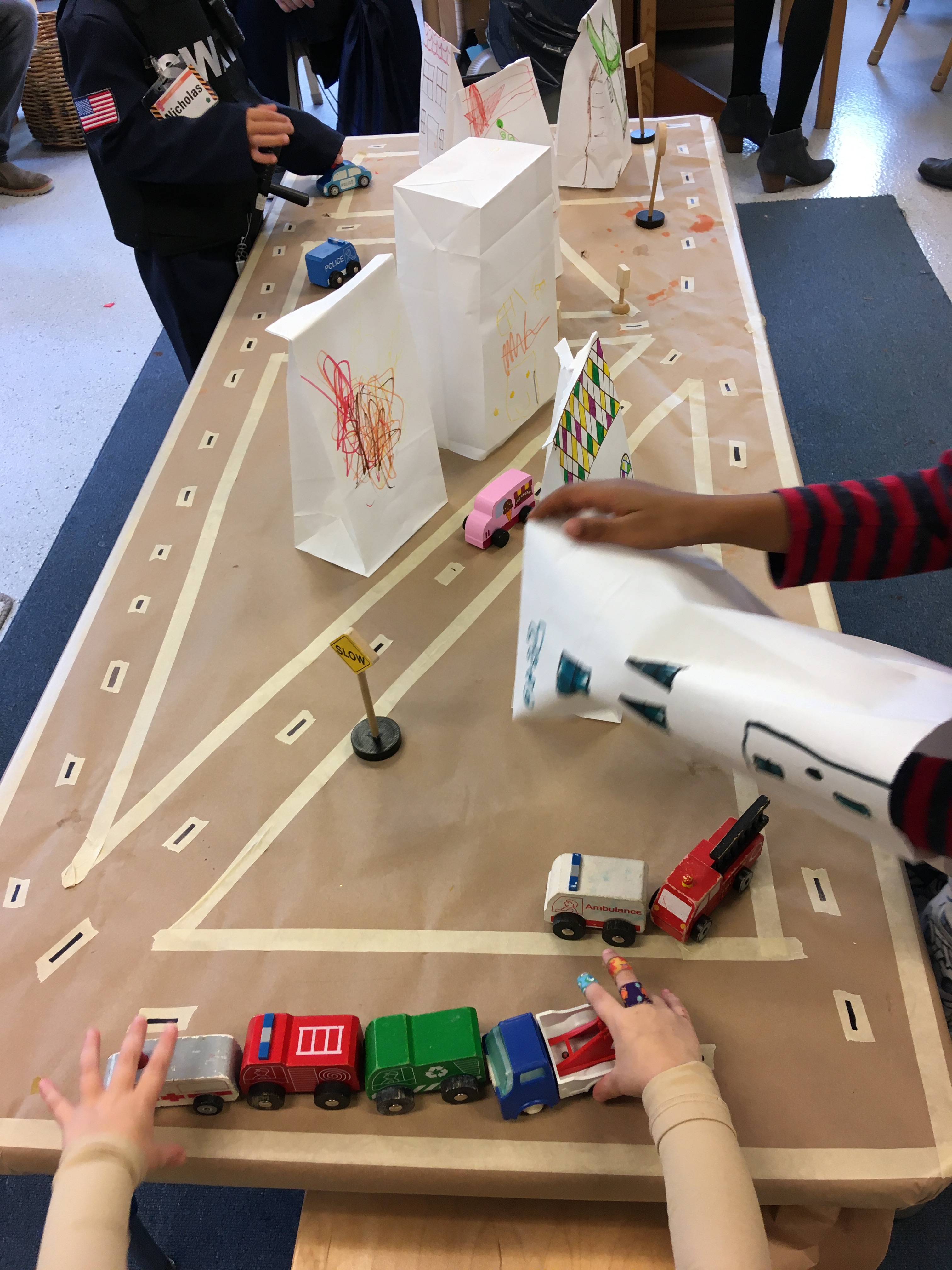 Most preschools have a play kitchen full of pretend food, dress-up clothes that allow children to play out many roles, plus baby dolls and stuffed animals to practice nurturing skills with. Many of those materials may be available every class during the year so children have lots of chances to explore them and use them in many ways. Teachers may also have special themes for dramatic play: maybe a farmer’s market in the fall, a gingerbread bakery in December, a valentine post office in February, or a spaceship and mission control.