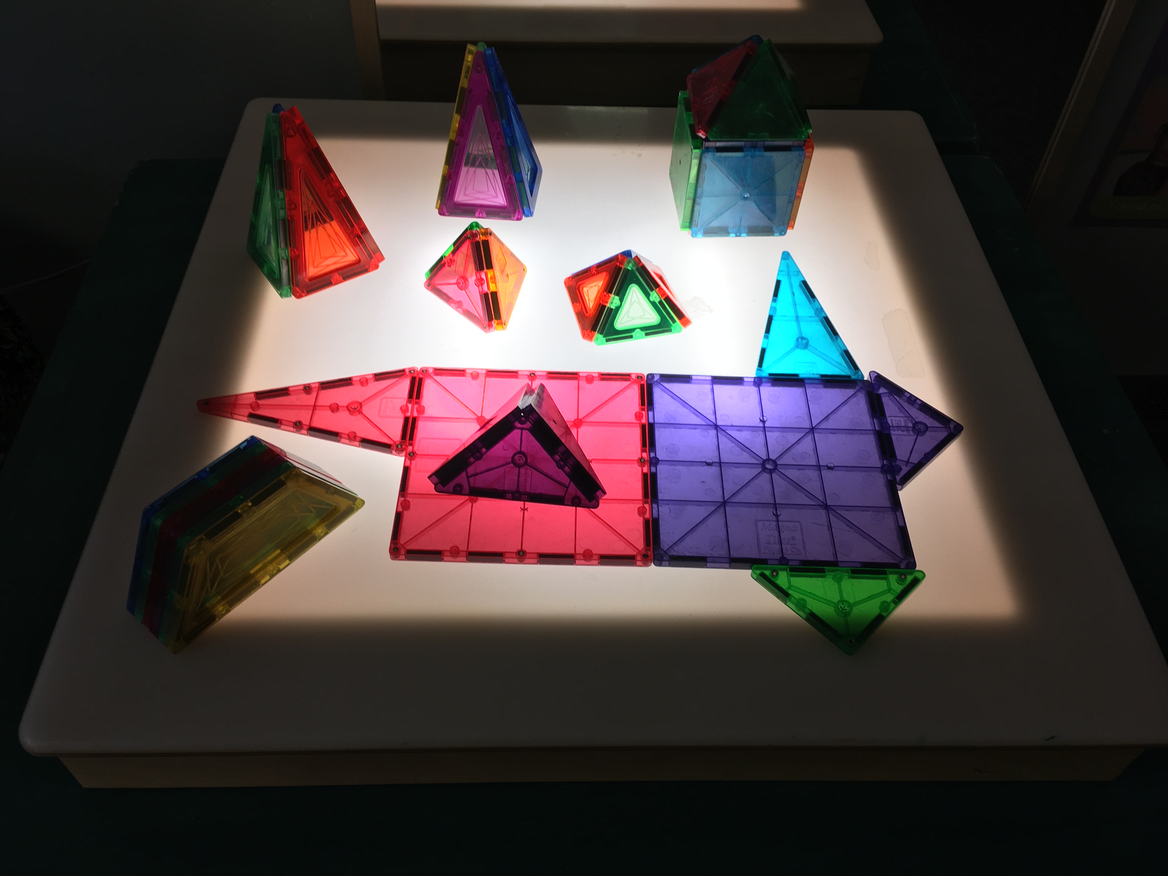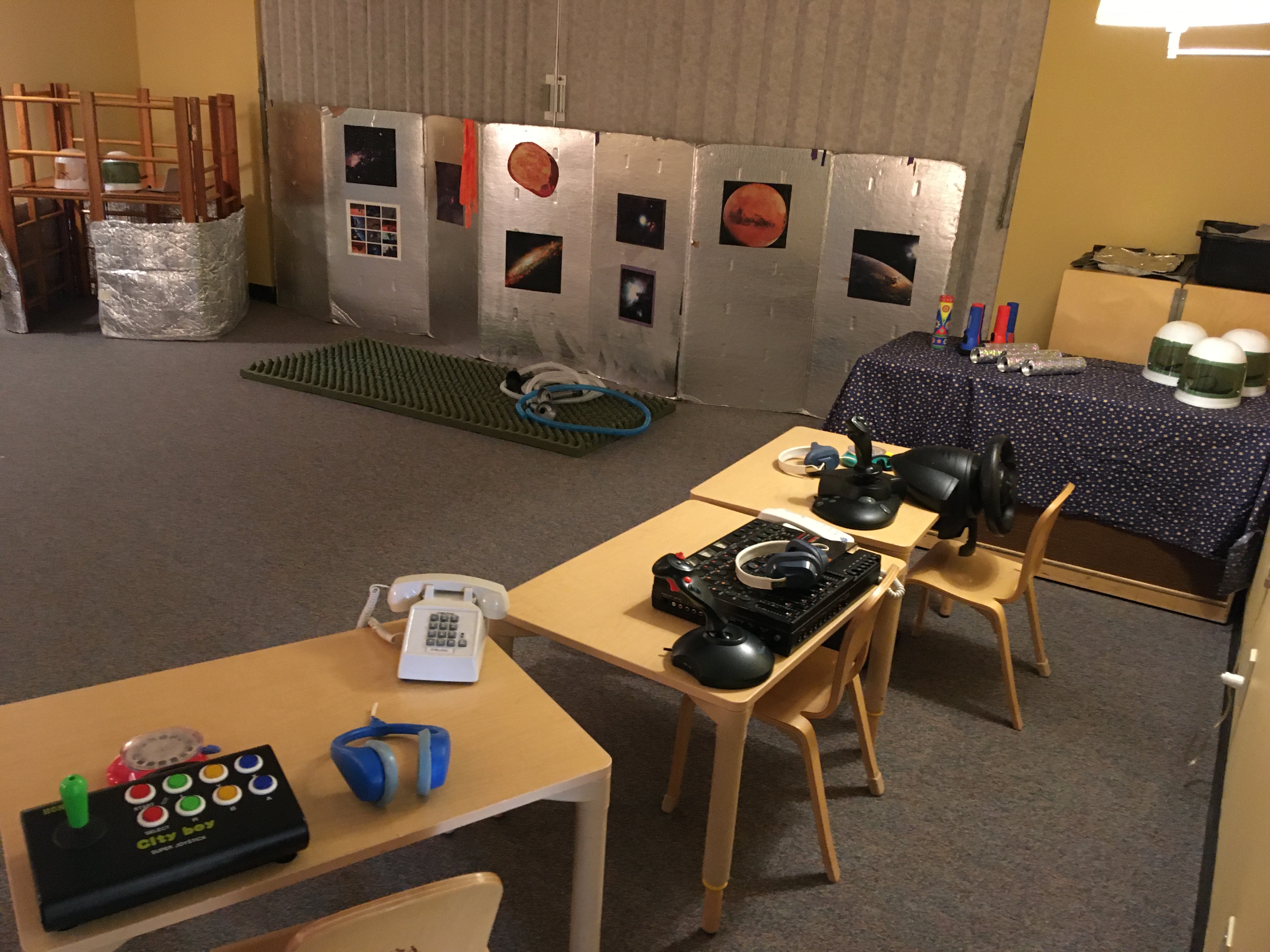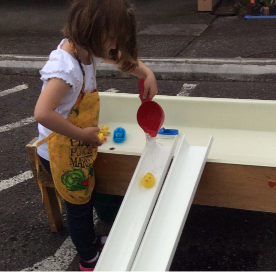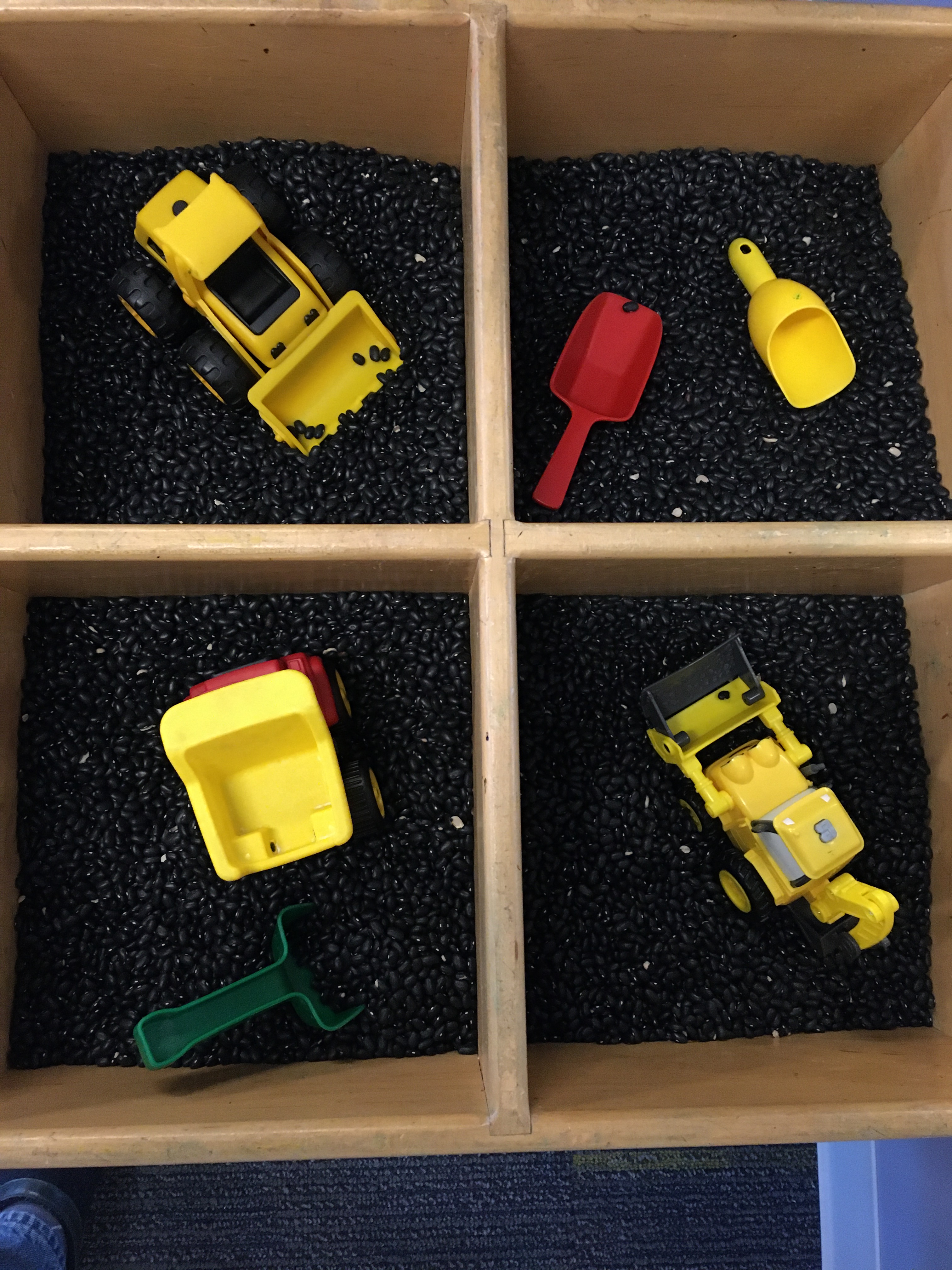 We have toy trains, toy cars, bulldozers and more. Children learn how wheeled vehicles move through the world and what happens when they crash. They learn how things need to be pushed up hills, but going downhill, they go fast on their own (physics!). And, because these toys tend to be very popular with our active, high energy kids, they also often provide opportunities to practice sharing and conflict resolution!