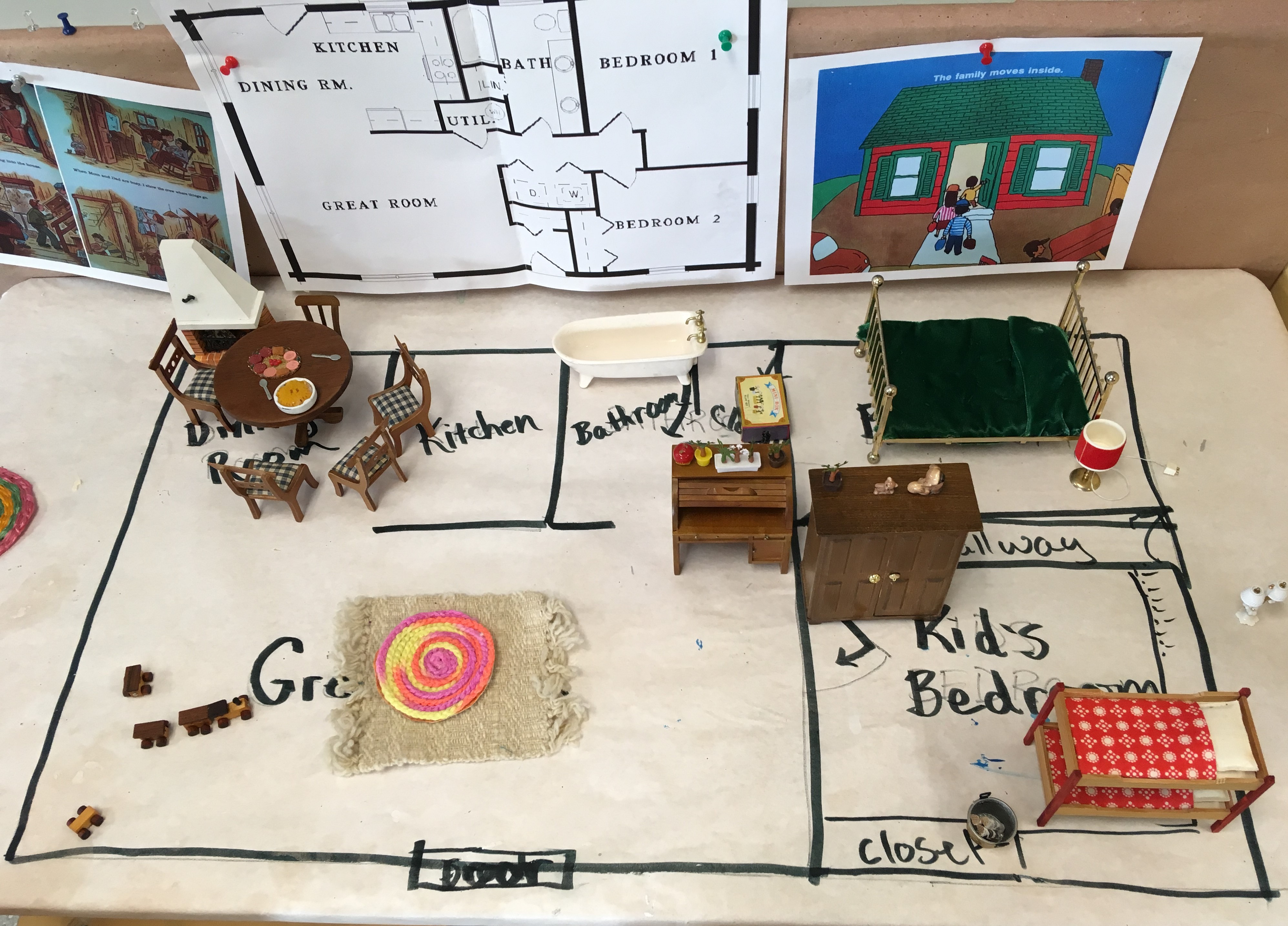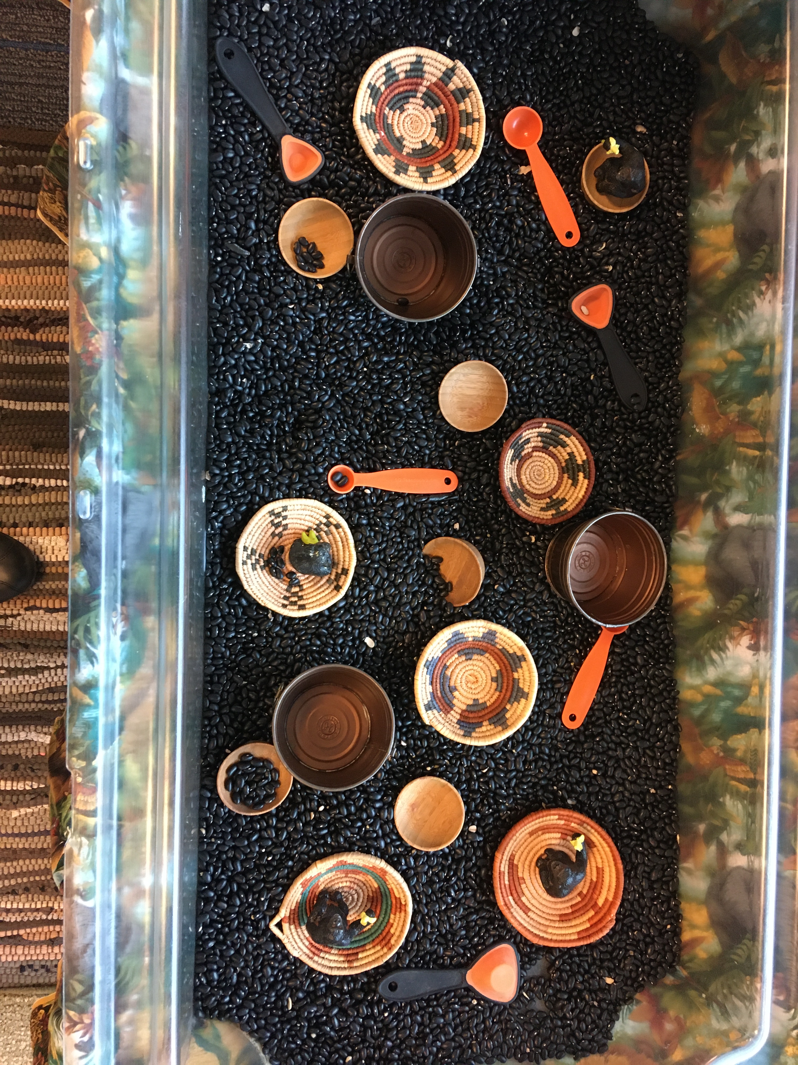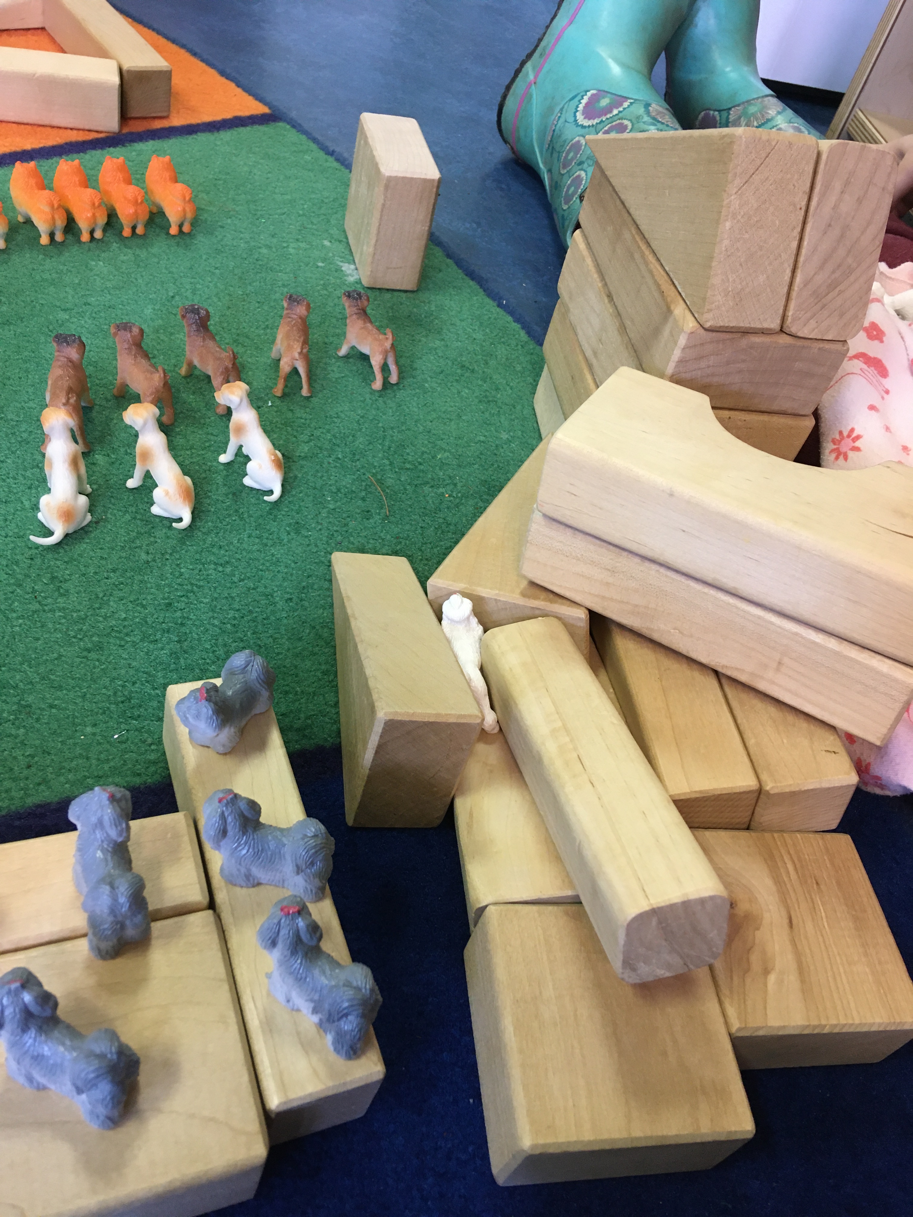 We have small dolls and doll house furniture. We have small plastic farm animals and farm equipment, woodland animals, and zoo animals. Kids may play with these and the cars on their own or they may be combined with the blocks, sensory bins, art supplies, pretend houses we made, and more. When children play with these small worlds, they do a lot of sorting (“I’ll put all the cows in this stall and all the horses in this stall”), counting (“I have 7 racecars that are ready for the race to begin”), and story-telling (“the lions were all roaring at the elephants”). They also co-create with other children – playing side by side sometimes, but then having their horse talk to the other horse, or their doll call the other’s doll to the table for food.