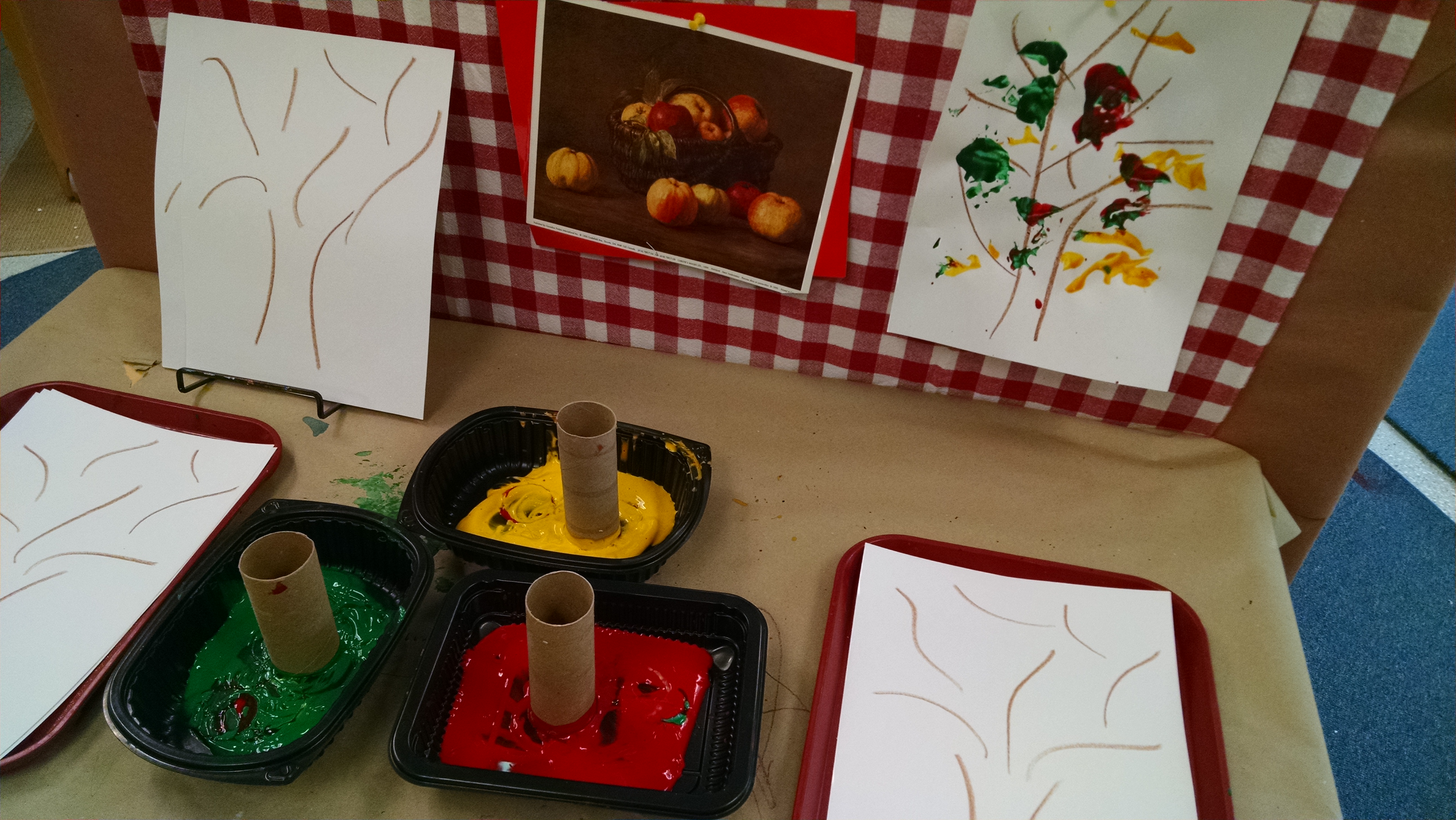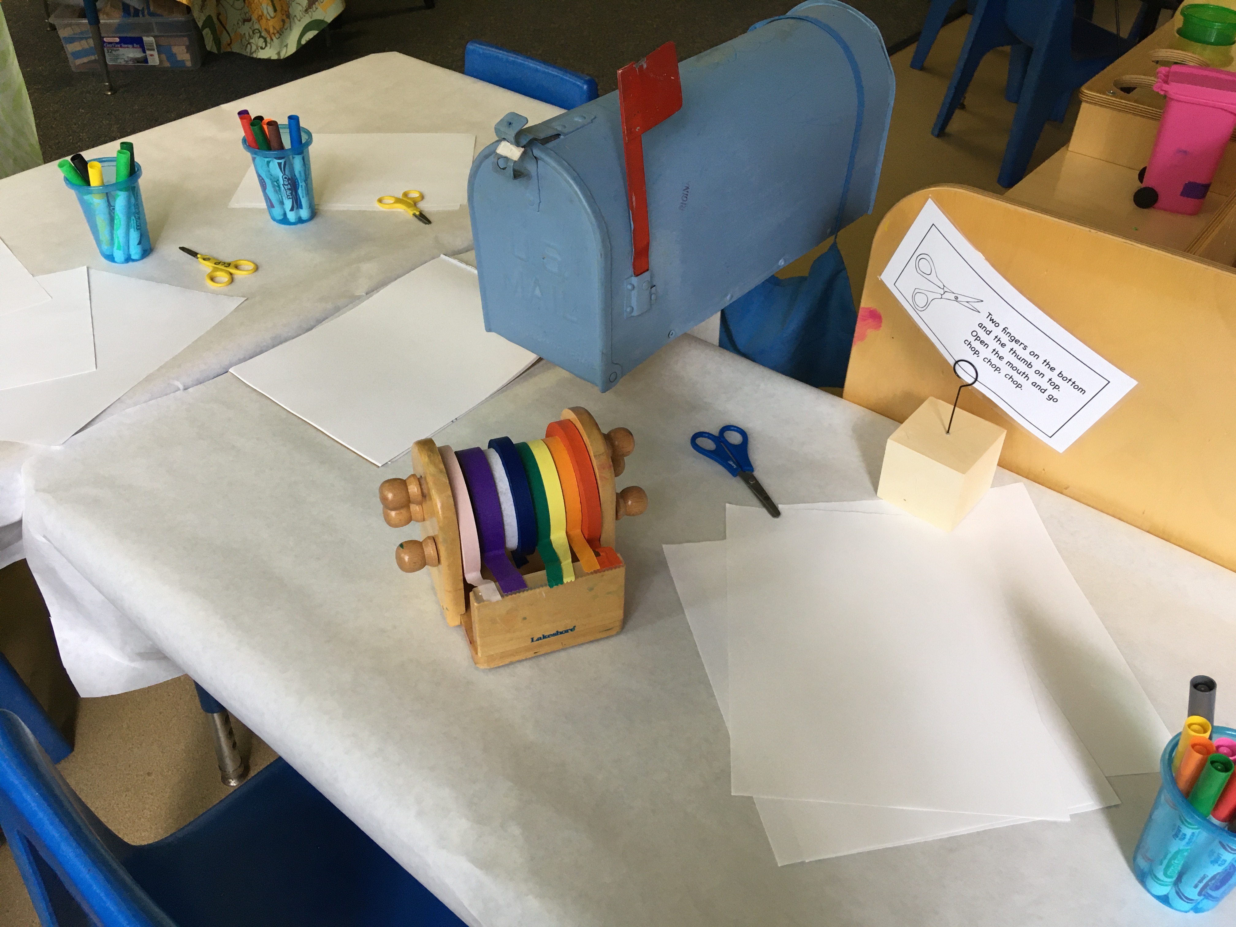 Preschools often have an easel set up every day, with various kinds of paints and various kinds of painting tools – brushes, rollers, sprayers, or sponges. Children are free to paint anything that they choose to. Many preschools have a “creation station” for collage, offering cardboard and paper for bases, glue and tape, and miscellaneous things to glue on: pompoms, googly eyes, plastic lids, tissue paper scraps, styrofoam popcorn, pretend jewels… almost anything! Many preschools have a writing station with office supplies – paper, markers, pencils, pencil sharpeners, staplers, hole punches, scissors, stickers, rubber stamps, envelopes and so on. Children can make cards for their parents, signs to support their pretend play, booklets, anything they choose. We also do wacky things like salad spinner painting or painting with cars or putting a paper plate on a record player and drawing as it goes round and round.