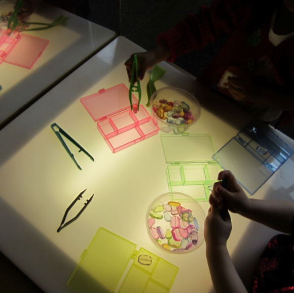 But when children play in a sandbox, or in a sensory bin full of rice or pompoms, or a water table, or on a light table, this multi-sensory experience can teach so many things. They build eye-hand coordination as they pour and scoop; learn concepts of empty and full, volume and weight – relevant to math; properties of solids and liquid in motion, that the amount of a substance remains the same even when the shape changes, and that some things sink and some things float (science!) They get comfortable with their hands being messy. (This is an important life skill – sometimes we all have to do messy things!)