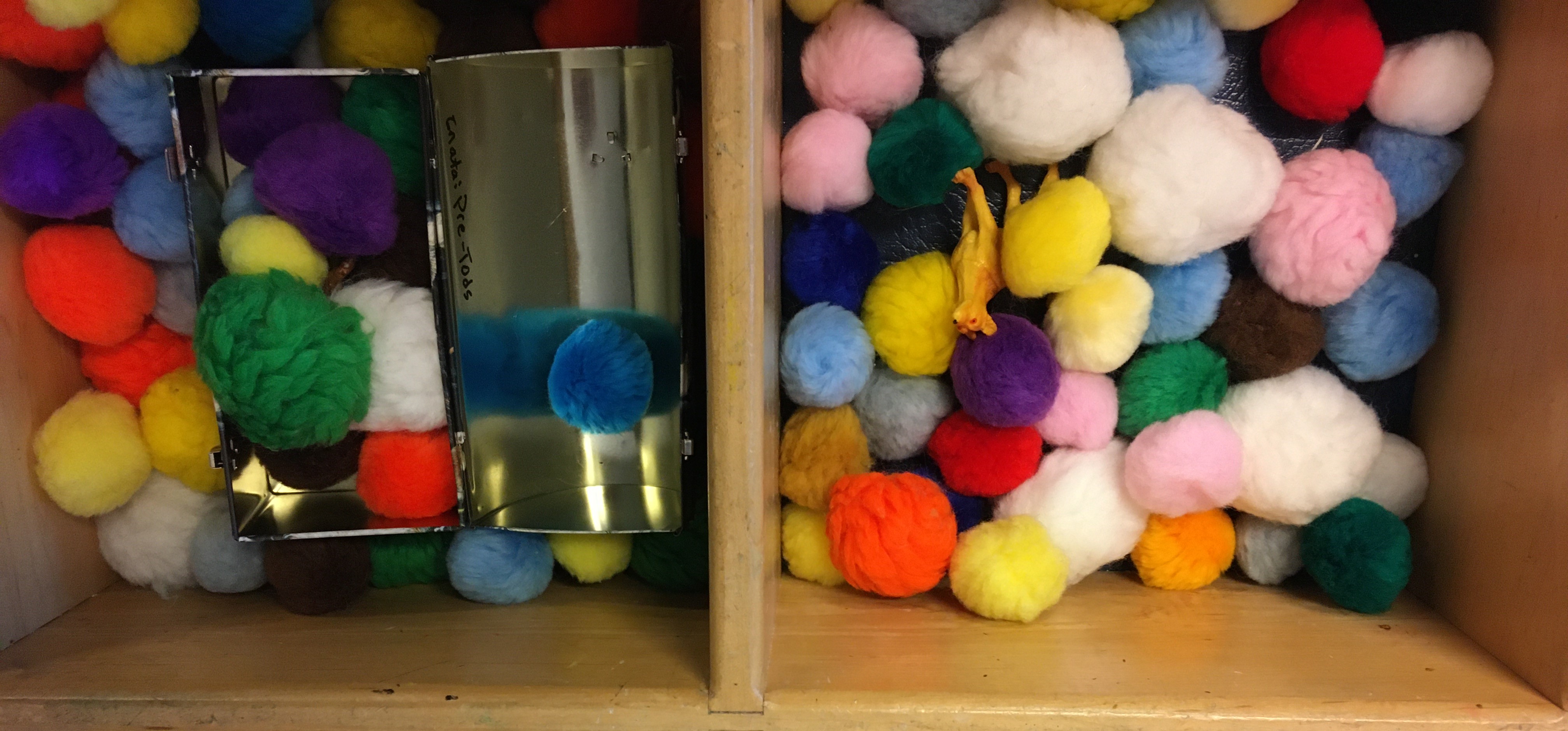 Start with fillers that are easy to clean up. I use pompoms as the first material for my toddler class. Or paper crumpled into balls. Later, I might use pinto beans – they’re easy to sweep up. Other things are harder to clean up. For example, kinetic sand needs to be vacuumed up and can get ground into carpet, so it’s not the thing to start with.