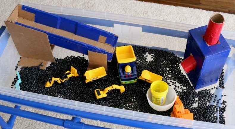 Kids LOVE to transport things. So, they often want to carry things from one place to another. Sometimes just having containers inside the bin, like having two buckets in the bin where they can move things from the bin to one bucket to the next is enough. Or setting up a cardboard box apparatus where there’s a higher spot in the sensory bin and a ramp for pouring things so they slide to the lower level, like these examples from Frugal Fun: