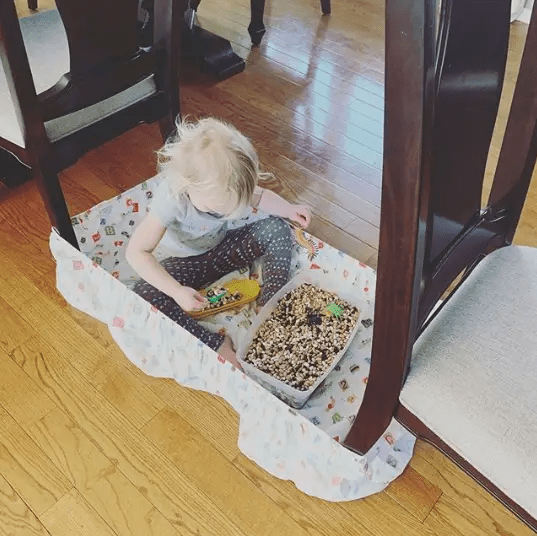 Many people recommend putting a mat under the table – like this mat where the edges can fold up to make a wall, or things like playpens and crafty pods and pop-up ball pits that help to contain the mess in one area where it doesn’t get tracked around. Some use fitted sheets – like in the image below (source) or shown here. Wrap the corners of the fitted sheet around some objects to create a little nest. Or use a table cloth or shower curtain liner. Sometimes you can salvage sensory material from any of these surfaces by lifting them up so the filler all slides to one corner and then scooping it from there.