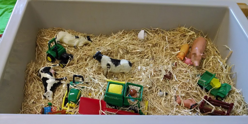 a bin – don’t feel like you have to start by buying a fancy table – it’s OK to start with water play in the sink or use a cake pan or a plastic storage tub