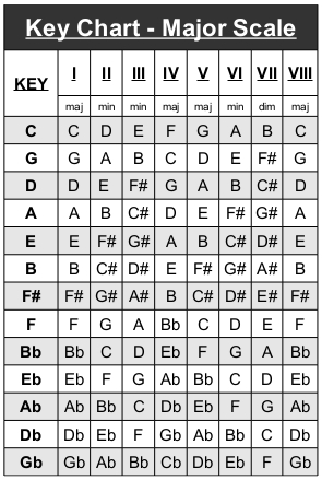 Another common progression, called the 50’s progression or the doo-wop progression, in Nashville numbering is I VI IV V (the same chords as I V VI IV described above, just in a different order). In the C major scale, that’s C–Am–F–G