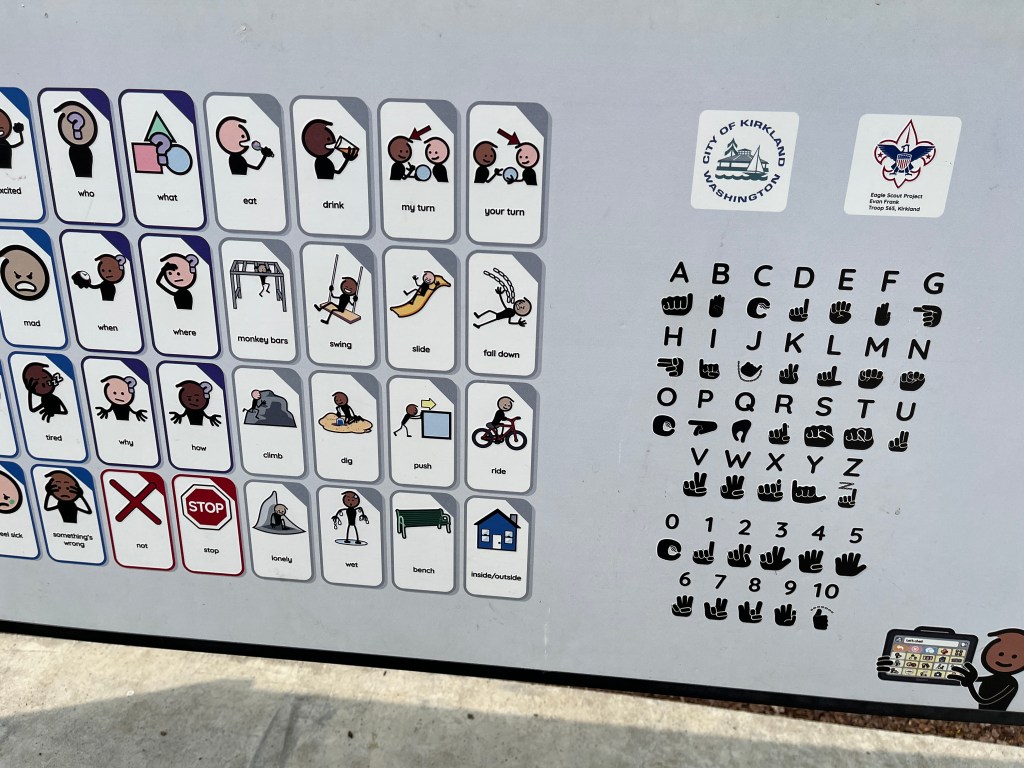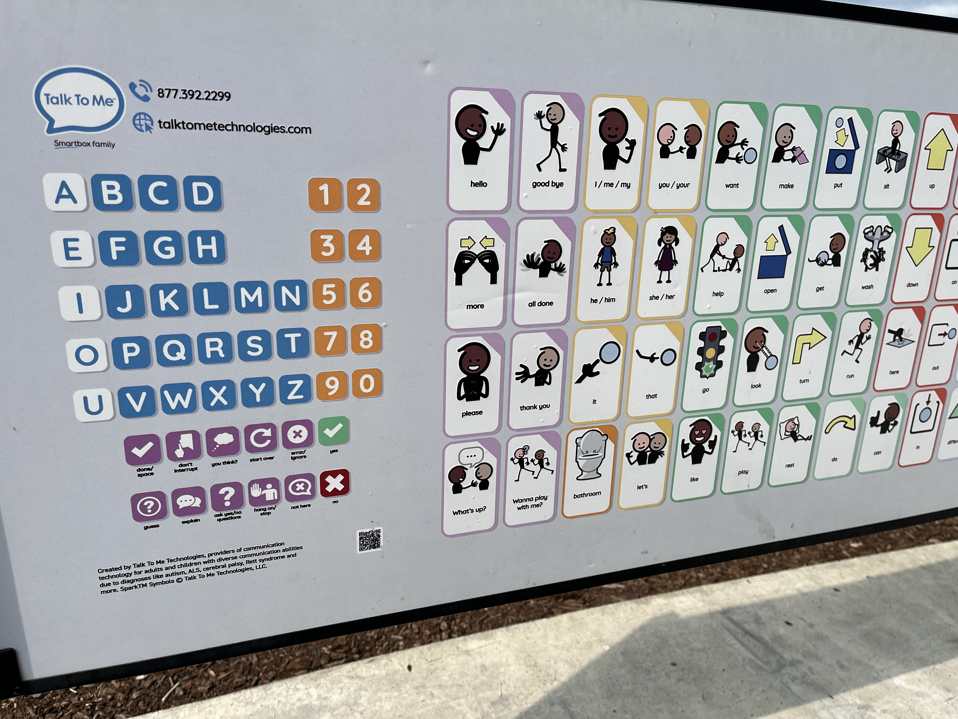 The big yellow hill is a fun and unique thing – bring a big flattened cardboard box to sit on and you can slide down that hill. On the playground there is also a communication board with symbols that a nonverbal person could use to communicate – it’s a nice opportunity to acquaint you and your child with this adaptive tool.