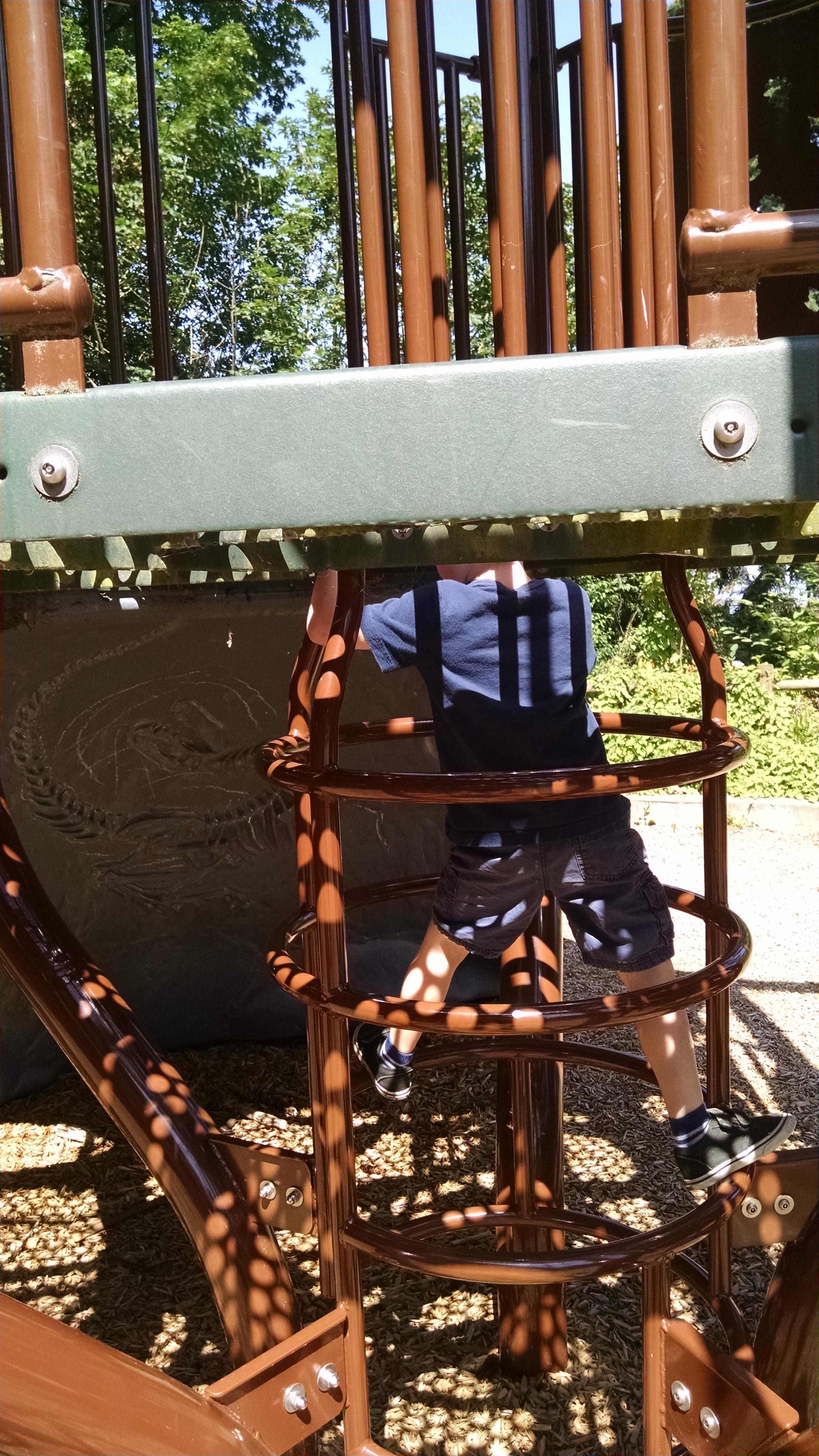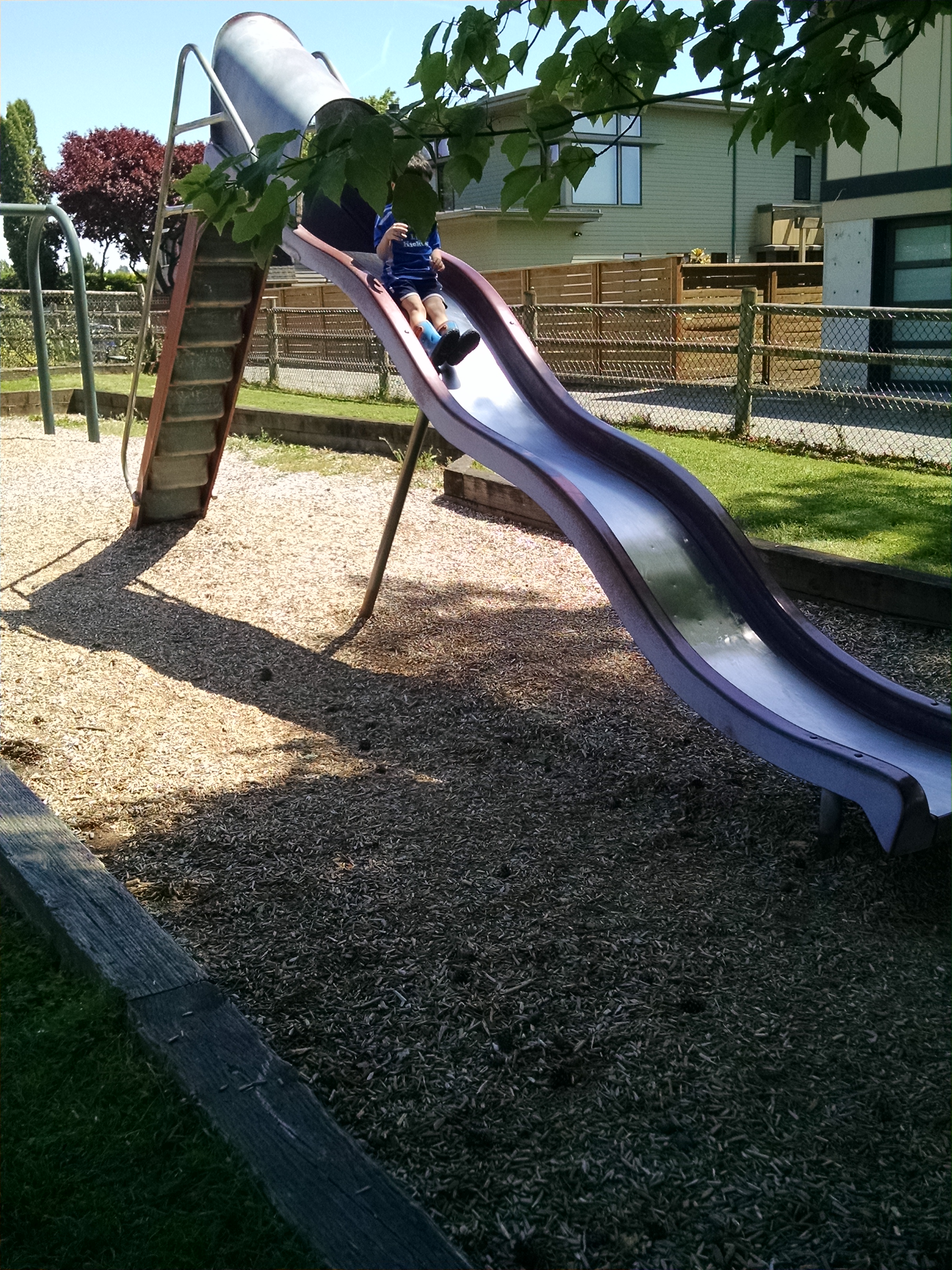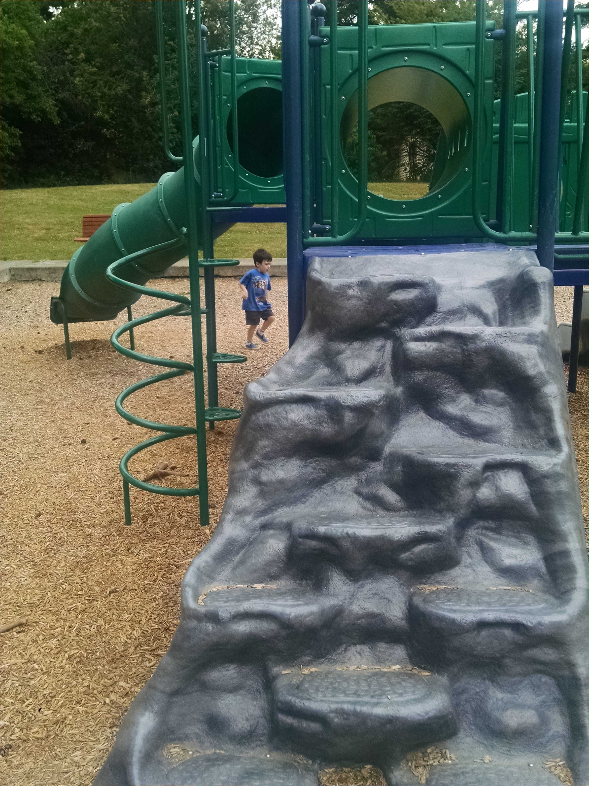 When we were there in early June, there was a GREAT old slide, but it’s slated to be replaced sometime this summer, and I’m not sure when that’s happening. (It may have already happened). It’s an old style metal slide, with three bumps. They’re big enough bumps that our 42 pound kid “catches air” going over them. He’d say “ouch, ouch, ouch” on the way down as he went over each bump, but he continued to ride the slide over and over, so I think he liked it.