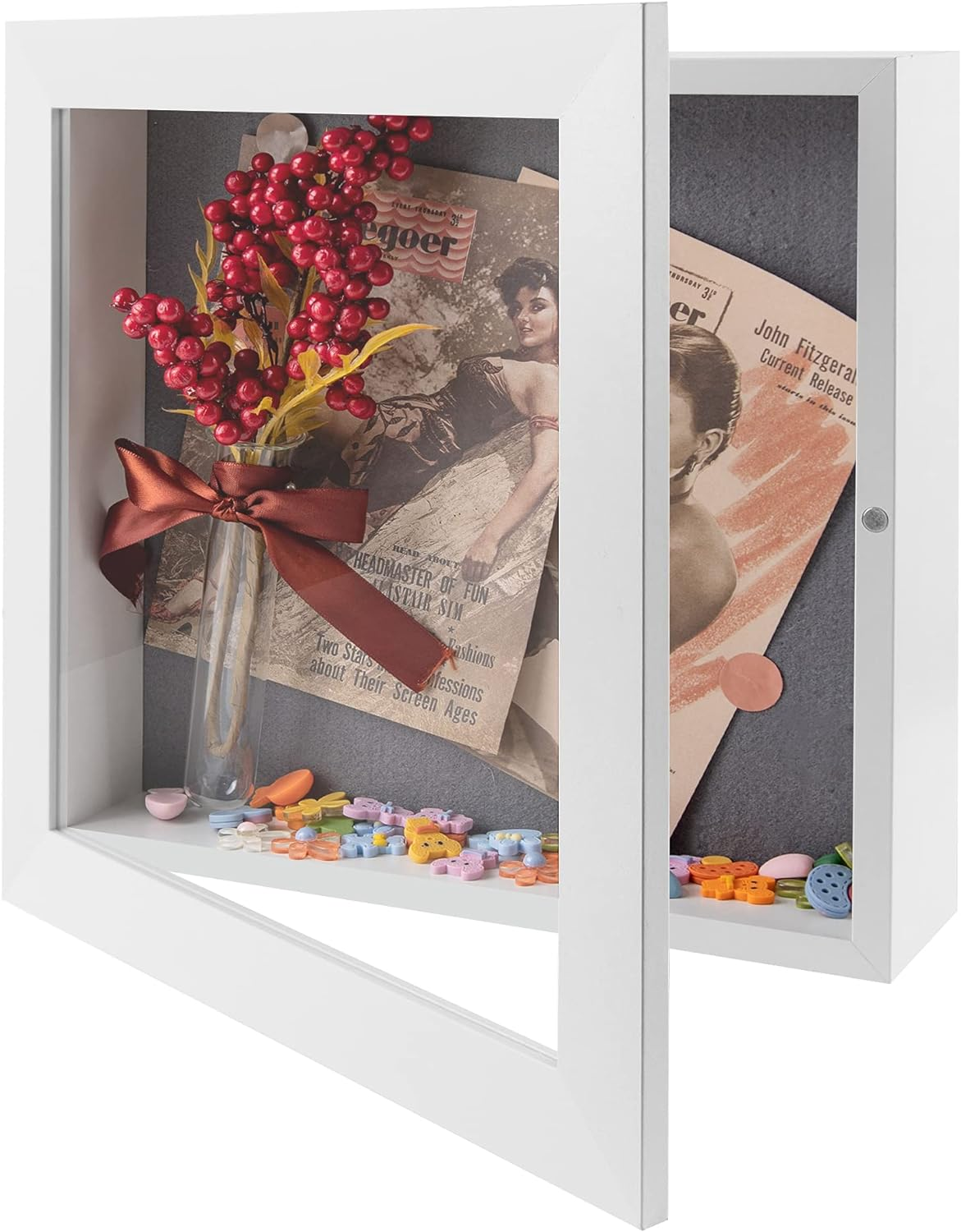 For smaller or three dimensional items, we had wood shadow box frames, which were 2 inches deep. We had four hung together on the wall (they were rectangular so we had two landscape orientation and two were portrait orientation.)