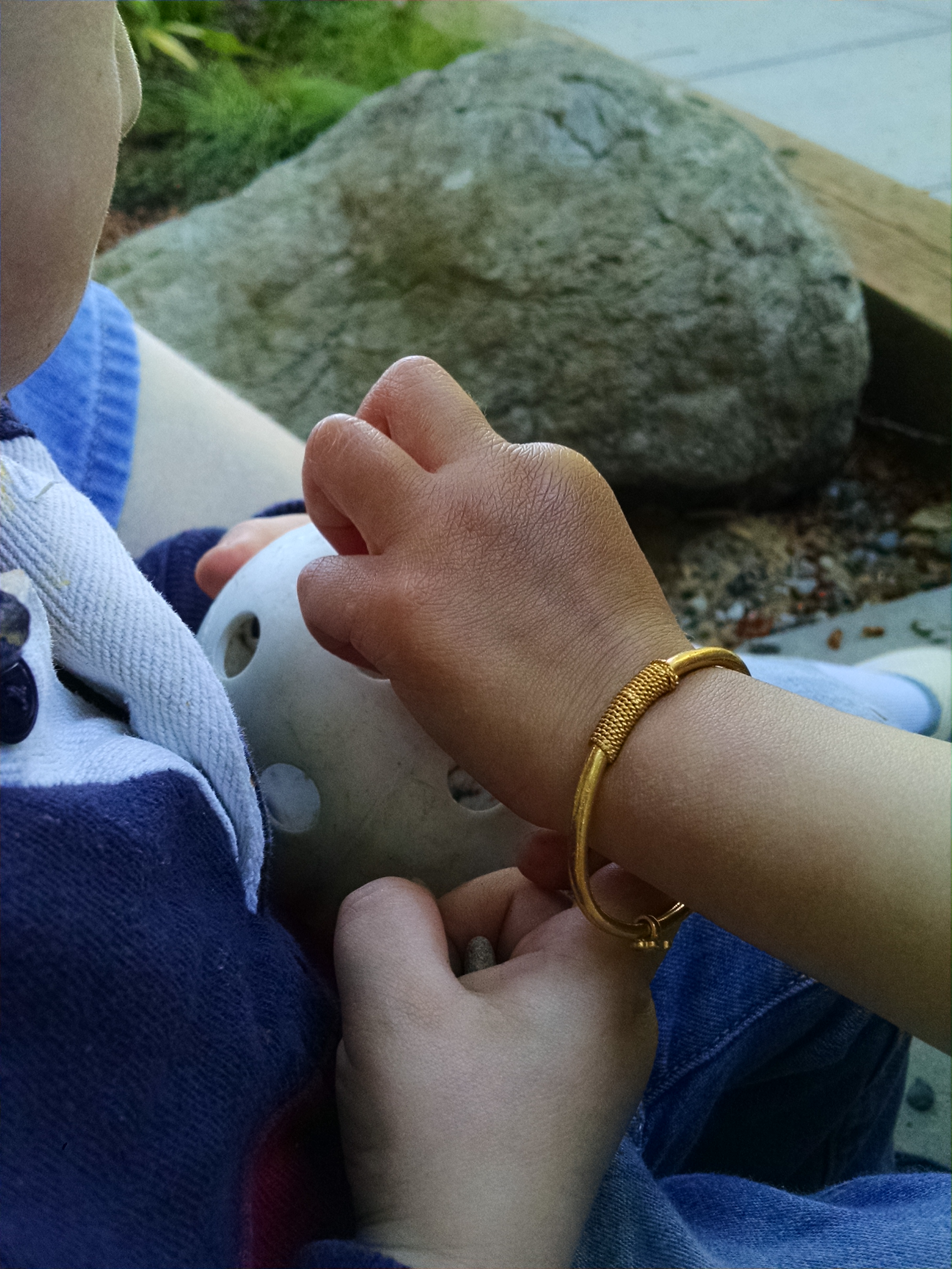 Then one child had a whiffle ball, and figured out he could put rocks in through the holes. A simple spontaneous shape sorter. Two other children started playing too, all working on putting rocks in through the holes. The inventor soon wandered away, but I sat with the other two for several minutes as we all put rocks in holes. Although 99% of the rocks around us were small enough to fit, one of the children had a magic talent for finding the rocks that were too big to fit. So I would offer smaller rocks in trade. Then we figured out that if you gently shook the ball, all the rocks would fall out. It was just a simple, quiet little game, as we all settled in and explored together. Simple but sweet.